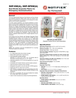 Datasheet for the Notifier SEP-SW and SEP-SPSW, published in 2012. Document No: DN-60711, Rev: A. 4 models including SEP-SW, SEP-SPSW, SEP-BBSW and 1 additional variants. Detailed technical specifications, electrical ratings, and agency listings.