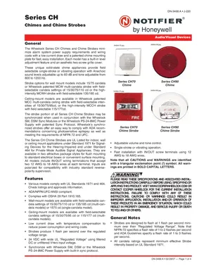 Datasheet for the Notifier Series CH Chimes and Chime Strobes, published in 2007. Document No: DN-3468, Rev: A. 6 models including CH70-24MCW-FR, CH70-24MCW-FW, CH70-241575W-FR and 3 additional variants. Product features, environmental operating limits, and compatibility data.