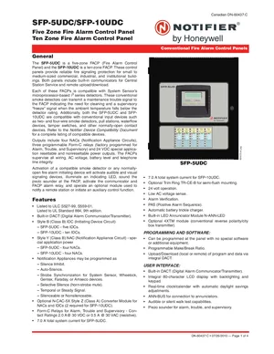 Datasheet for the Notifier SFP-5UDC and SFP-10UDC (Canadian), published in 2010. Document No: DN-60437, Rev: C. 16 models including SFP-5UDC, SFP-10UDC, N-CAC-5X and 13 additional variants. Detailed technical specifications, electrical ratings, and agency listings.