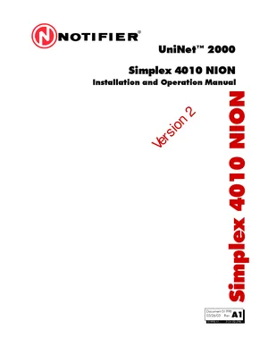 Installation and Operations Manual for the Notifier Simplex 4010 NION, published in 2003. Document No: 51998, Rev: A1. 8 models including Simplex 4010 NION, 4010-9811, NION-NPB and 5 additional variants. Hardware mounting, wiring, and user system management.