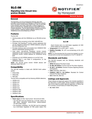 Datasheet for the Notifier SLC-IM, published in 2017. Document No: DN-60755, Rev: C. 15 models including SLC-IM, VHX-1420-HFS, NFS2-3030 and 12 additional variants. Detailed technical specifications, electrical ratings, and agency listings.