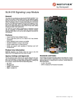 Datasheet for the Notifier SLM-318, published in 2021. Document No: DN-62115, Rev: B. 5 models including SLM-318, N16, PMB and 2 additional variants. Detailed technical specifications, electrical ratings, and agency listings.