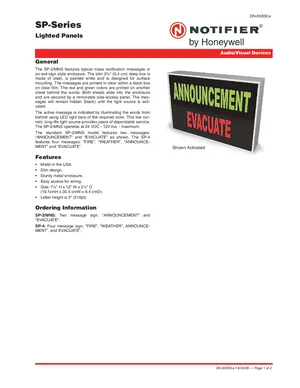 Datasheet for the Notifier SP-Series Lighted Panels, published in 2008. Document No: DN-60359, Rev: a. Models SP-2/MNS and SP-4. Product features, environmental operating limits, and compatibility data.