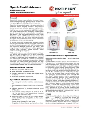 Datasheet for the Notifier SpectrAlert Advance Mass Notification, published in 2009. Document No: DN-60517, Rev: A. 37 models including SW-ALERT, SWH-ALERT, SPSW-ALERT and 34 additional variants. Detailed technical specifications, electrical ratings, and agency listings.