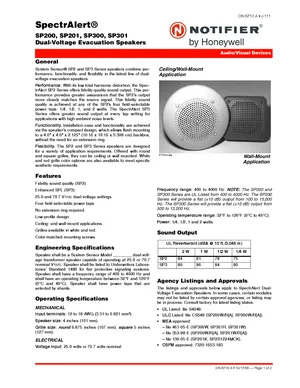Datasheet for the Notifier SpectrAlert Dual-Voltage Speakers, published in 2006. Document No: DN-6710, Rev: A. 4 models including SP200, SP201, SP300 and 1 additional variants. Detailed technical specifications, electrical ratings, and agency listings.