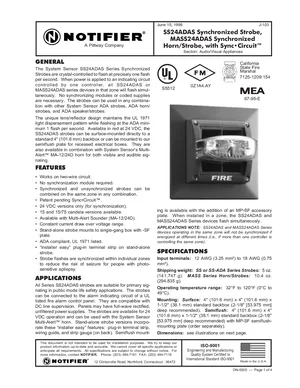 Datasheet for the Notifier SS24ADAS and MASS24ADAS, published in 1998. Document No: DN-5505. 8 models including SS24ADAS, MASS24ADAS, SS2415ADAS and 5 additional variants. Product features, environmental operating limits, and compatibility data.