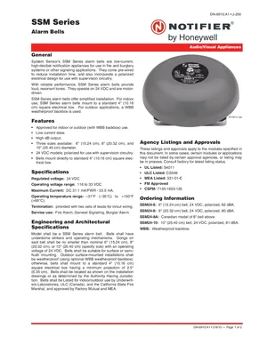 Datasheet for the Notifier SSM Series Alarm Bells, published in 2010. Document No: DN-6910, Rev: A1. 4 models including SSM24-6, SSM24-8, SSM24-8A and 1 additional variants. Product features, environmental operating limits, and compatibility data.