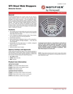 Datasheet for the Notifier STI Steel Web Stoppers, published in 2010. Document No: dn-4936, Rev: A1. 6 models including STI9601, STI9609, STI9604 and 3 additional variants. Engineering specifications, wiring diagrams, and mounting dimensions.