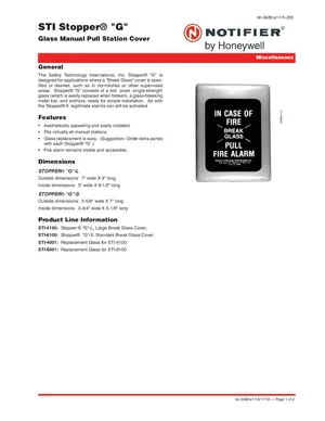 Datasheet for the Notifier STI Stopper G, published in 2010. Document No: dn-3486, Rev: a1. Models STI-4100 and STI-6100. Detailed technical specifications, electrical ratings, and agency listings.