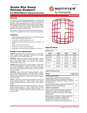 Datasheet for the Notifier Strobe Wire Guard Damage Stopper, published in 2010. Document No: DN-60651, Rev: A. 6 models including STI9705, STI9705-R, STI9708 and 3 additional variants. Product features, environmental operating limits, and compatibility data.