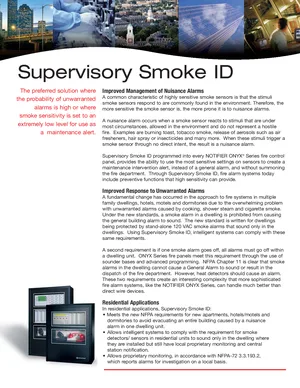Brochure for the Notifier Supervisory Smoke ID, published in 2005. Document No: M-SS-SSID, Rev: 01/06/05. Models ONYX Series and VIEW. Product highlights, key features, and application overview.