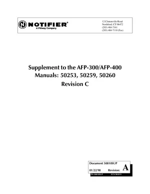 Manual for the Notifier Supplement for AFP-300/AFP-400 Installation Manual, published in 1998. Document No: 50810SUP, Rev: A. 8 models including AFP-300, AFP-400, NAM-232 and 5 additional variants. Component descriptions, indicators and controls, and user interactions.