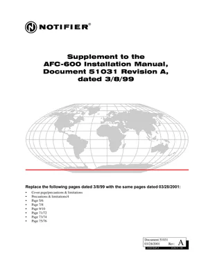 Manual for the Notifier Supplement to the AFC-600 Installation Manual, published in 2001. Document No: 51031, Rev: B. 41 models including AFC-600, UDACT, 4XTM and 38 additional variants. System overview, features and capabilities, and basic operation.
