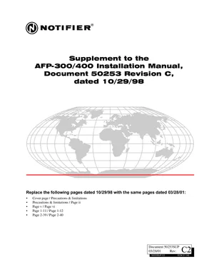 Installation Manual for the Notifier Supplement to the AFP-300/400, published in 2001. Document No: 50253, Rev: D. 68 models including AFP-300, AFP-400, CRE-4 and 65 additional variants. Hardware installation, terminal connections, and environmental requirements.