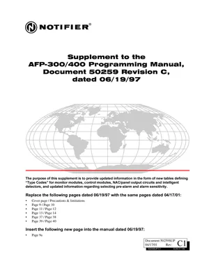 Manual for the Notifier Supplement to the AFP-300/400 Programming Manual, published in 2001. Document No: 50259SUP, Rev: C1. 17 models including AFP-300, AFP-400, FSP-751 and 14 additional variants. Capabilities, specifications summary, and usage notes.