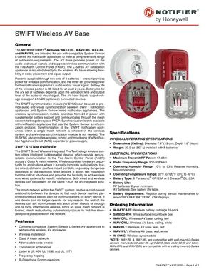 Datasheet for the Notifier SWIFT Wireless AV Base, published in 2020. Document No: DN-61067, Rev: C. 4 models including WAV-CRL, WAV-CWL, WAV-RL and 1 additional variants. Product features, environmental operating limits, and compatibility data.