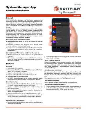 Datasheet for the Notifier System Manager App, published in 2017. Document No: DN-60983, Rev: A. 8 models including SYSTEMGR1, SYSTEMGR5, SYSTEMGR10 and 5 additional variants. Detailed technical specifications, electrical ratings, and agency listings.