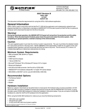 Installation Manual for the Notifier UPDL-1020, published in 1997. Document No: 50527, Rev: B. 10 models including UPDL-1020, AM2020, AFP1010 and 7 additional variants. Mounting instructions, wiring diagrams, and system power-up procedures.