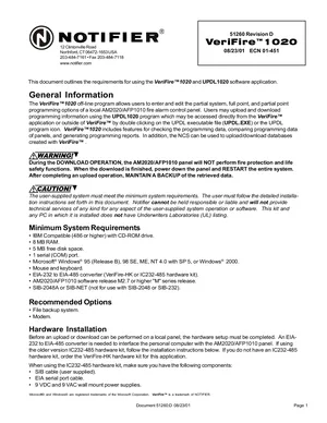 Installation Manual for the Notifier VeriFire 1020, published in 2001. Document No: 51260, Rev: D. 10 models including VeriFire 1020, UPDL1020, AM2020 and 7 additional variants. Hardware installation, terminal connections, and environmental requirements.