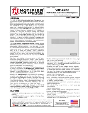 Datasheet for the Notifier VXP-25/50, published in 1998. Document No: DN-6655. 20 models including VXP-25/50, FC-PSM, FC-AAM25 and 17 additional variants. Product features, environmental operating limits, and compatibility data.
