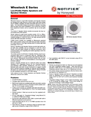 Datasheet for the Notifier E Series Speakers and Strobes, published in 2009. Document No: dn-5741, Rev: a. 11 models including E70-24MCW-FR, E70-24MCW-FW, E70-241575W-FR and 8 additional variants. Product features, environmental operating limits, and compatibility data.