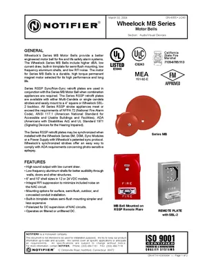 Datasheet for the Notifier MB Series Motor Bells, published in 2004. Document No: DN-4774, Rev: 03/30/04. 4 models including MB-G6-12-R, MB-G6-24-R, MB-G10-12-R and 1 additional variants. Detailed technical specifications, electrical ratings, and agency listings.