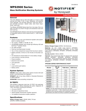 Datasheet for the Notifier WPS2900 Series Warning Systems, published in 2012. Document No: DN-60360, Rev: B. 17 models including WPS2900, WPS2901, WPS2902 and 14 additional variants. Product features, environmental operating limits, and compatibility data.