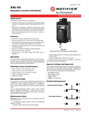 Datasheet for the Notifier XAL-53, published in 2010. Document No: DN-5274, Rev: A1. Model XAL-53. Engineering specifications, wiring diagrams, and mounting dimensions.
