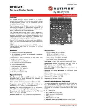 Datasheet for the Notifier XP10-M, published in 2009. Document No: DN-6923, Rev: B. 5 models including XP10-M, XP10-MA, BB-XP and 2 additional variants. Detailed technical specifications, electrical ratings, and agency listings.