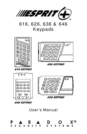 User Guide for the Paradox Esprit 616, 626, 636 and 646, published in 2001. Document No: K6X6EU-09, Rev: 09. 4 models including 616, 626, 636 and 1 additional variants. End-user operating instructions, system navigation, and daily operation procedures.