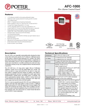 Datasheet for the Potter AFC-1000, published in 2022. Document No: 8830136, Rev: J. 53 models including AFC-1000, PSN-1000, PSN-1000E and 50 additional variants. Detailed technical specifications, electrical ratings, and agency listings.