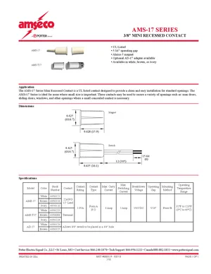 Datasheet for the Potter AMS-17 Series Mini Recessed Contact, published in 2010. Document No: 8880119, Rev: B. Models AMS-17, AMS-T17 and AD-17. Detailed technical specifications, electrical ratings, and agency listings.