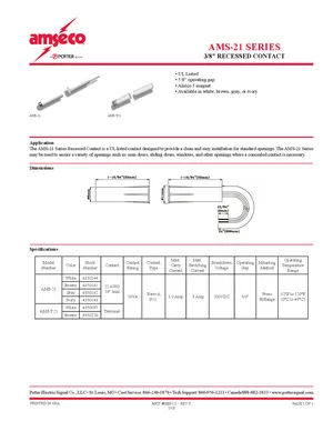 Datasheet for the Potter AMS-21 Series Recessed Contacts, published in 2010. Document No: 8880121, Rev: C. Models AMS-21 and AMS-T21. Engineering specifications, wiring diagrams, and mounting dimensions.