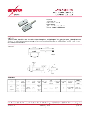 Datasheet for the Potter AMS-7 Series Magnetic Contacts, published in 2010. Document No: 8880122, Rev: B. Models AMS-7 and AMS-7D. Engineering specifications, wiring diagrams, and mounting dimensions.