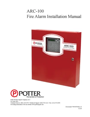 Installation Manual for the Potter ARC-100, published in 2020. Document No: 5403650, Rev: E. 18 models including ARC-100, CA-6075, SLCE-127 and 15 additional variants. Physical installation guide, backbox dimensions, and cabling specifications.
