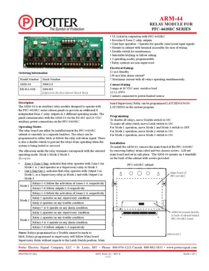 Installation Manual for the Potter ARM-44, published in 2015. Document No: 5401202, Rev: E. Models ARM-44, PFC-4410RC and BB-RA-44R. Physical installation guide, backbox dimensions, and cabling specifications.