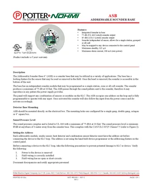 Datasheet for the Potter ASB, published in 2013. Document No: 8830011, Rev: C. Models ASB and ASB-6. Product features, environmental operating limits, and compatibility data.