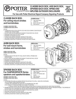 Installation Manual for the Potter Back Boxes and Enclosures, published in 2015. Document No: 550-0669-AAA. 10 models including CLNGBB-R, CLNGBB-W, AVBB-R and 7 additional variants. Physical installation guide, backbox dimensions, and cabling specifications.