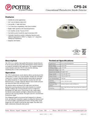 Datasheet for the Potter CPS-24, published in 2019. Document No: 8830137, Rev: C. 4 models including CPS-24, PS-24, PS-24H and 1 additional variants. Engineering specifications, wiring diagrams, and mounting dimensions.