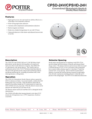 Datasheet for the Potter CPSD-24V and CPSHD-24H, published in 2022. Document No: 8830158, Rev: C. Models CPSD-24V and CPSHD-24H. Product features, environmental operating limits, and compatibility data.