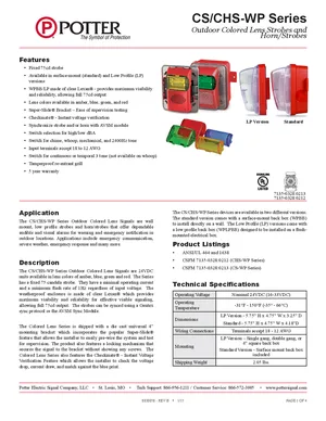 Datasheet for the Potter CS/CHS-WP Series, published in 2015. Document No: 8830058, Rev: B. 32 models including CS-24WAR-WP, CS-24WAW-WP, CS-24WBR-WP and 29 additional variants. Product features, environmental operating limits, and compatibility data.