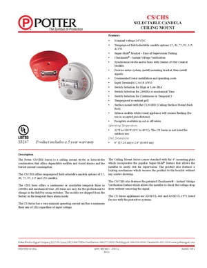 Datasheet for the Potter CS and CHS Series, published in 2013. Document No: 8830051, Rev: A. 8 models including CS-24R, CS-24W, CS-24PR and 5 additional variants. Engineering specifications, wiring diagrams, and mounting dimensions.