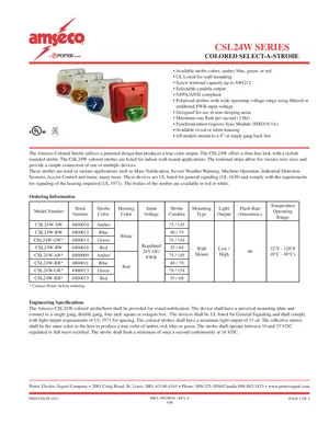 Datasheet for the Potter CSL24W Series Colored Strobes, published in 2006. Document No: 8850038, Rev: A. 10 models including CSL24W-AW, CSL24W-BW, CSL24W-GW and 7 additional variants. Detailed technical specifications, electrical ratings, and agency listings.