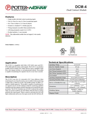 Datasheet for the Potter DCM-4, published in 2014. Document No: 8830008, Rev: B. Model DCM-4. Detailed technical specifications, electrical ratings, and agency listings.
