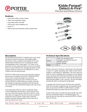 Datasheet for the Potter Detect-A-Fire Detectors, published in 2019. Document No: 8820045, Rev: A. 13 models including 12-X27020-000, 12-X27020-001, 12-X27021-000 and 10 additional variants. Product features, environmental operating limits, and compatibility data.