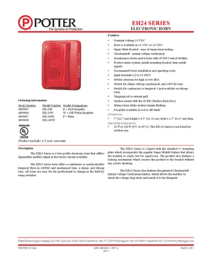 Datasheet for the Potter EH24 Series Electronic Horn, published in 2013. Document No: 8830053, Rev: A. 6 models including EH-24R, EH-24W, EH-24PR and 3 additional variants. Detailed technical specifications, electrical ratings, and agency listings.