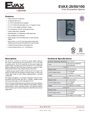 Datasheet for the Potter EVAX-25, EVAX-50 and EVAX-100, published in 2018. Document No: 8830116, Rev: B. 13 models including EVAX-25, EVAX-50, EVAX-100 and 10 additional variants. Engineering specifications, wiring diagrams, and mounting dimensions.