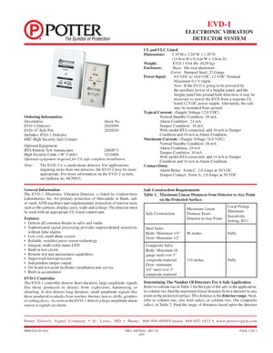 Datasheet for the Potter EVD-1, published in 2009. Document No: 8870016, Rev: M. 4 models including EVD-1, EVD-1C, EVD-2 and 1 additional variants. Detailed technical specifications, electrical ratings, and agency listings.