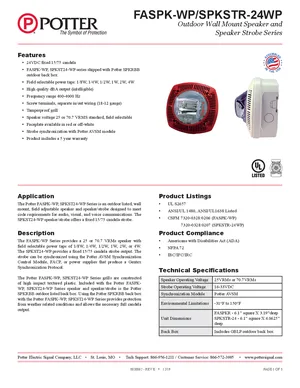 Datasheet for the Potter FASPK-WP and SPKSTR-24WP Series, published in 2019. Document No: 8830062, Rev: E. 9 models including FASPK-WP, SPKST24-WP, FASPK-WPR and 6 additional variants. Engineering specifications, wiring diagrams, and mounting dimensions.