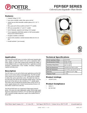Datasheet for the Potter FEP/SEP Series Colored Lens, published in 2018. Document No: 8830067, Rev: C. 8 models including FEP-A, FEP-B, FEP-G and 5 additional variants. Detailed technical specifications, electrical ratings, and agency listings.